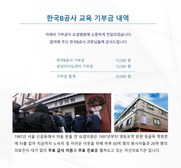한국B공사 중간관리자 리더십 교육 기부금 내역 페이지 정보 조회 388회 작성일 10-31 17:34 목록 본문 . 이전글한국E정보원 4급 리더십 역량강화 과정 기부금 내역 11.19 다음글서울B진흥원 승진후보자 과정 기부금 내역 07.27